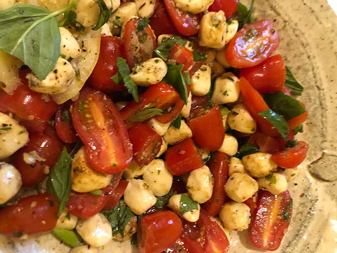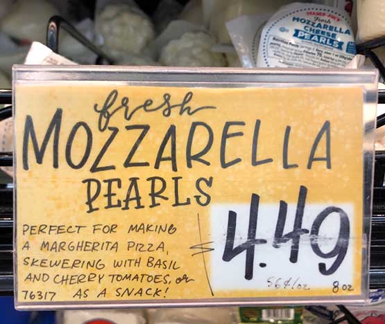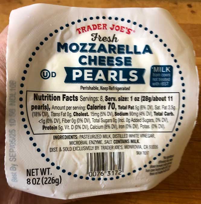 As the name say, these are mozzarella shaped into little balls, or pearls. I made them into a Caprese salad along with cherry tomatoes and fresh basil, plus balsamic and olive oil. They are pretty good for salads and the like. Or for tossing into a pasta dish. You can also take these and marinate them with garlic and oil. About $4.29 for a pound. I do think though that I prefer the large mozzarella logs as I think that cheese is a bit softer. I can cut those into any size piece I want. These are cute though and they can be made into marinated mozzarella pearls which people love.
