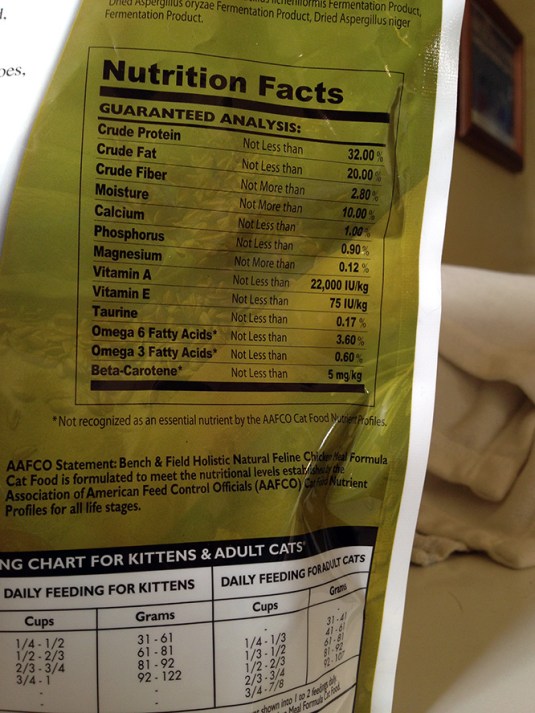 Compared to the TJ brand dry cat food, I would say Bench & Field scores a bit higher from a standpoint of ingredients listed, which if you look at the label all seem to be good, “honest”, healthy stuff (for instance, no “chicken by-products” which even Purina Pro Plan has). The label says 32% protein which comes from a variety of meats and grains: chicken, brown rice, anchovy, sardines, egg, oatmeal. Also has a bunch of fruits and veggies, plus other good stuff if you look closely at the listed ingredients like kelp, quinoa and a lot of probiotics too! Yes – “Health Food For Pets”.
