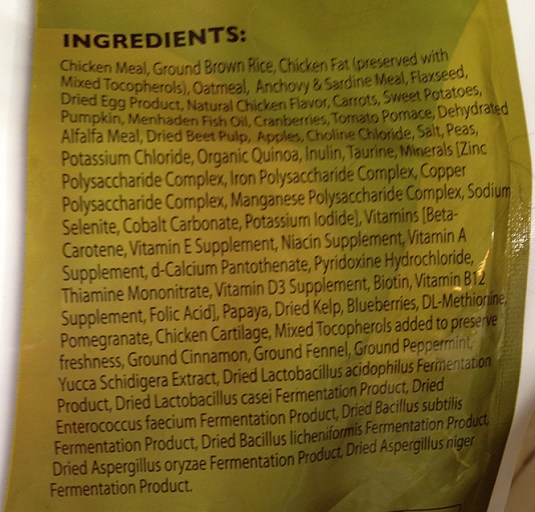 • Nature’s Greens and Grains including oatmeal, flaxseed, organic quinoa and dehydrated kelp.