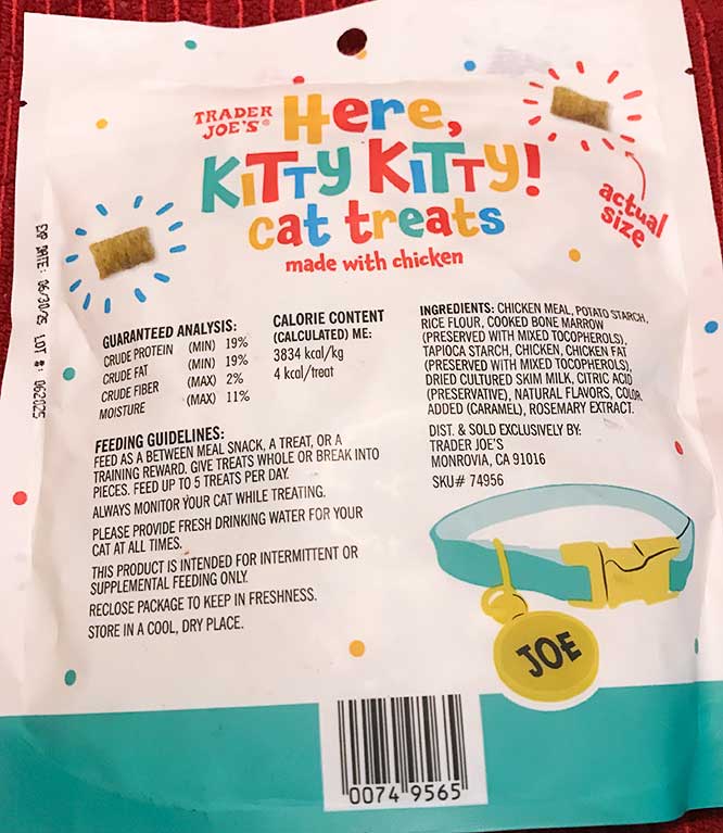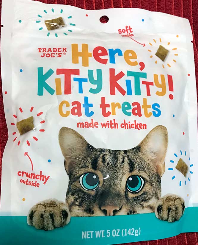 Trader Joe’s “HERE KITTY KITTY!” CAT TREATS (‘made with chicken’)