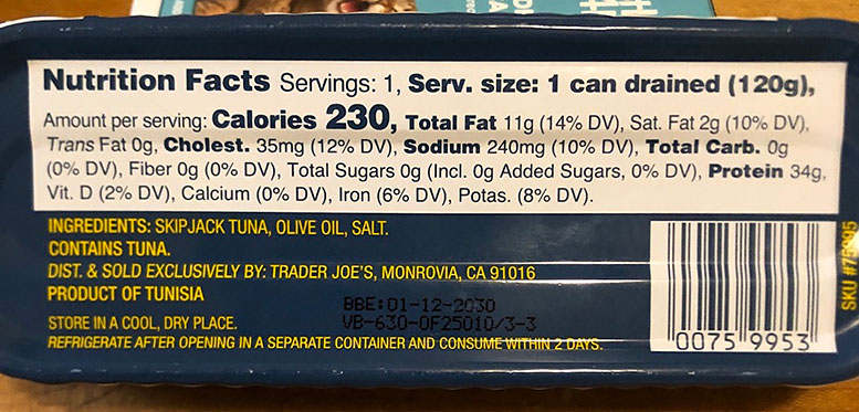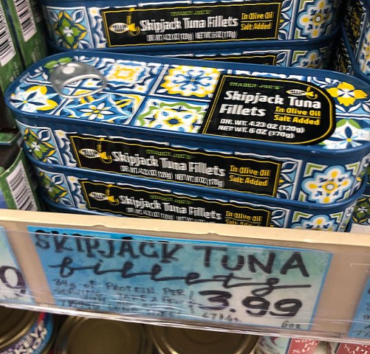 Trader Joe’s SKIPJACK TUNA FILLETS in Olive Oil $3.99 (6 oz net weight, drained 4.2 oz) I would buy this again.