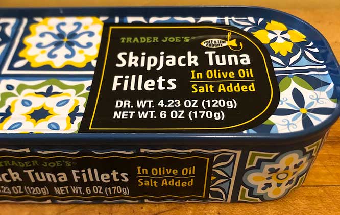 Trader Joe’s says: ‘”Has there ever been a better time to be a tinned fish enthusiast? It seems like all sorts of prepossessing piscine proteins are popping up on shelves, and we here at Trader Joe’s are proud to do our part with options like Trader Joe’s Skipjack Tuna Fillets in Olive Oil. They’re made for us by a supplier in Tunisia, who sources their Skipjack Tuna in the Mediterranean, which is caught via sustainable pole-and-line fishing methods to reduce by-catch. The loin of the Tuna is cut into long, flat fillets, then lightly salted and cooked to perfection, then packed in Olive Oil so that they’re ready to be used in all sorts of culinary contexts right out of the tin.”