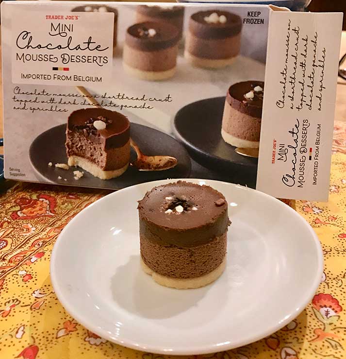I think this is a new dessert, or at least we hadn’t seen it before. MINI CHOCOLATE MOUSSE. Individual tiny chocolate mousse cakes that are Imported from Belgium, where they know a little bit about chocolate!