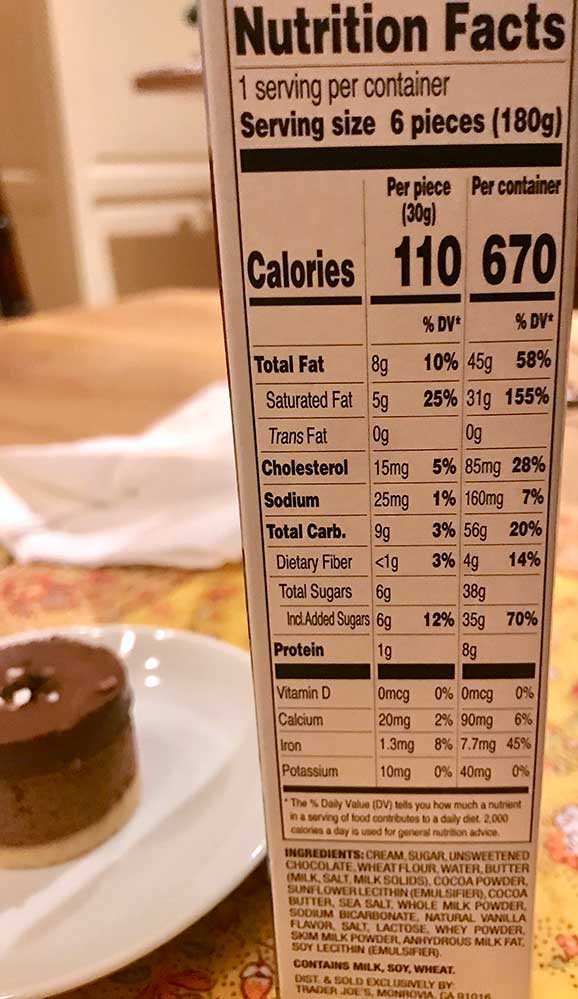 Reading the label though, we were all a bit confused by it saying “1 serving per container” as well as “serving size 6 pieces”! What? They think this box is one serving? Now each one is small, only about 3 bites each. I could eat 2 easily. Maybe even 3…. Still I don’t think anyone should eat six. Odd Nutrition label. Still each serving of one piece says its (only) 110 calories. Not bad at all and they are very light as mousse is airy.