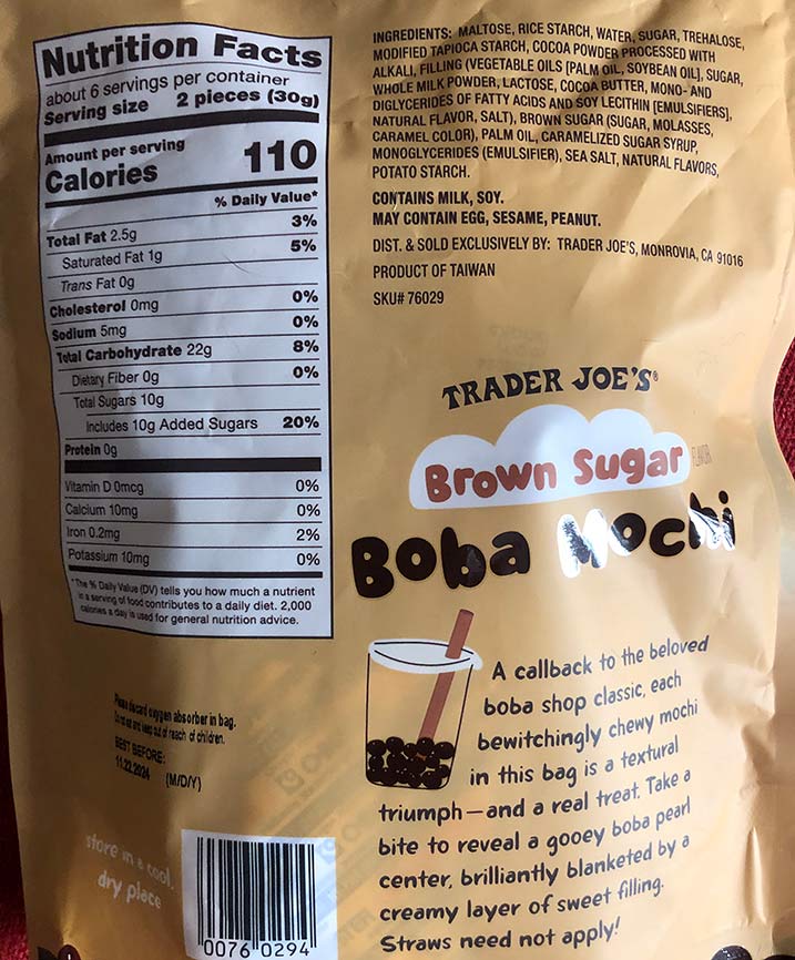 But this new item is a small bite size treat which is a little like that but different. These have a thin layer of something like mochi and an interior of “boba” like tapioca in the center. They are each wrapped individually.