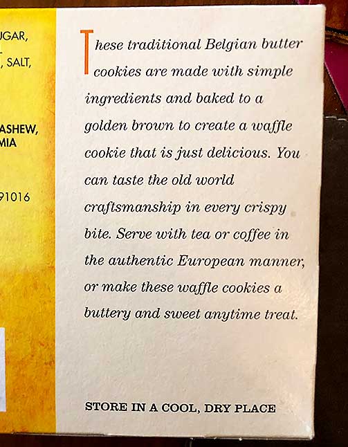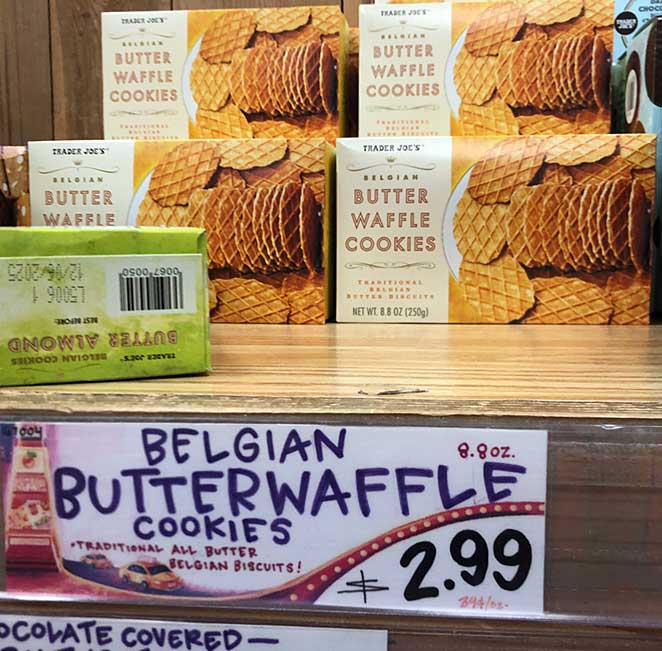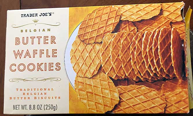 “Each all-butter wafer is baked to a crispy golden brown that creates a straightforward, delicious waffle cookie ready to enjoy at any time. The flavor is somewhere between a freshly baked waffle cone and shortbread cookie and is as simple as cookies come, but oh, so delicious. Super buttery, with the ideal amount of sweetness, these Belgian Butter Waffle Cookies are more versatile than you may expect. Whether you are looking for an authentic European snack to accompany a cup of tea or a mug of coffee, a companion for ice cream, or a counterpart to cheese, cured meats, and peppers, Trader Joe’s Belgian Butter Waffle Cookies have a place in your shopping cart, your pantry, and your tummy.”