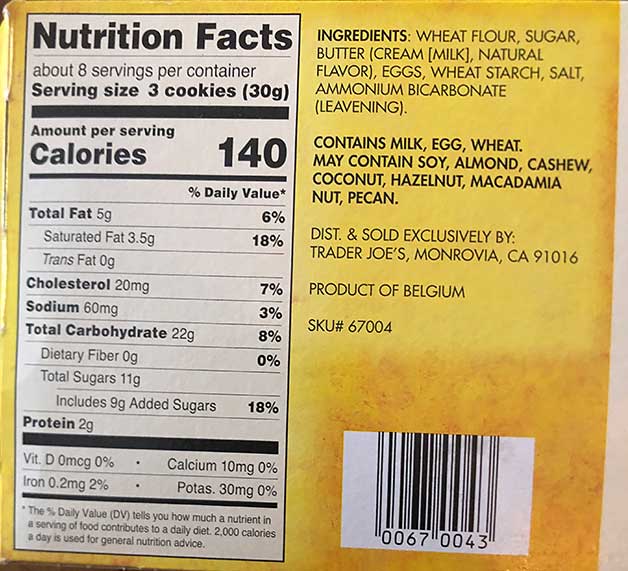 Trader Joe’s says this: “These Cookies are, indeed, made for us in France. The usual cookie-dough suspects—flour, sugar, egg yolks, milk, leavening, and salt—are combined with cultured French butter (13% of the recipe) to create a dough that is shaped into thin rounds. The baked biscuits are coated in rich, Dark Chocolate (40% of the recipe), yielding an exquisite Cookie that is at the same time: smooth, crunchy, chocolate-y, and buttery!”