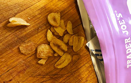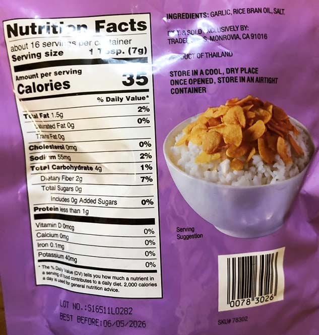 They say: “Trader Joe’s Crispy Garlic ably demonstrates, when sliced thin and fried to a glorious golden brown, garlic’s gifts easily extend into the textural realm, too. We tried plenty of options before finding this iteration of Crispy Garlic, which is brought to us by an expert supplier in Thailand. Only their Crispy Garlic was able to capture that flavorful-but-not-bitter, nicely-fried-but-not-tough, crunchy-but-still-melt-in-your-mouth quality that our tasting panel adored. We think you’ll adore it, too. Trader Joe’s Crispy Garlic is excellent as a topping on stir-fries, salads, and scrambled eggs; pizzas, pastas, and pad Thai; or even burgers, baked potatoes, and bánh mi. It can be mixed into homemade cheesy dips and casseroles, sprinkled over noodle dishes or roasted veggies, or even just enjoyed over a bowl of freshly made rice.” – Trader Joe’s