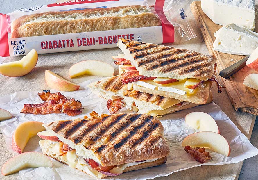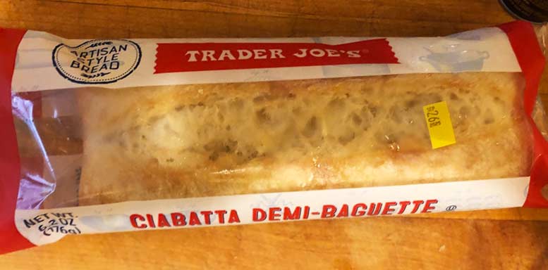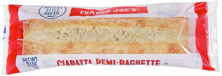 Trader Joe’s says: ” The loaf is in the shape of a half baguette (“demi-” and “wand” in Italian), but the bread itself is ciabatta bread. Ciabatta dough contains a higher moisture content than traditional baguette dough—over 70% in this case— giving it a thin, slightly caramelized crust and a light crumb with large holes. Better yet, it’s made with just a few ingredients: unbleached wheat flour, water, sea salt, yeast, and malted barley. Though our supplier makes large quantities of bread, they are still able to achieve the sought-after artisanal taste and texture.”