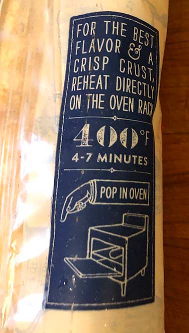 “For best flavor and crispy crust, pop into a 400F oven for 4-7 minutes“