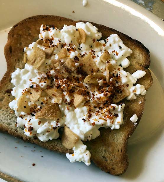 Here I put some on top of cottage cheese on top of a toasted slice of their Sourdough Sliced bread and added some spices, and the combo was super yummy.