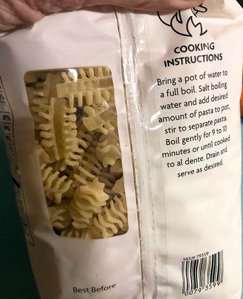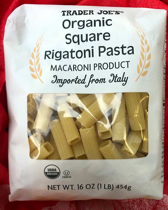 TJ’s says this: ” What makes this pasta noteworthy? It starts with the Italian pasta maker sourcing high-quality, organic, and local durum wheat semolina, then going the extra mile to mill the flour themselves. High-quality tools are equally essential —bronze-coated extruders are used to produce thick, textured noodles that deliver a perfectly al dente texture, which helps support the heftiness of its partnered sauce while maintaining a delicate chew….Pair this uniquely shaped Pasta with a hearty Bolognese sauce and be in awe of how much sauce clings to, and even fills, each noodle. It is a natural choice for baked pasta dishes, as it can hold up well in a casserole without losing its shape.”