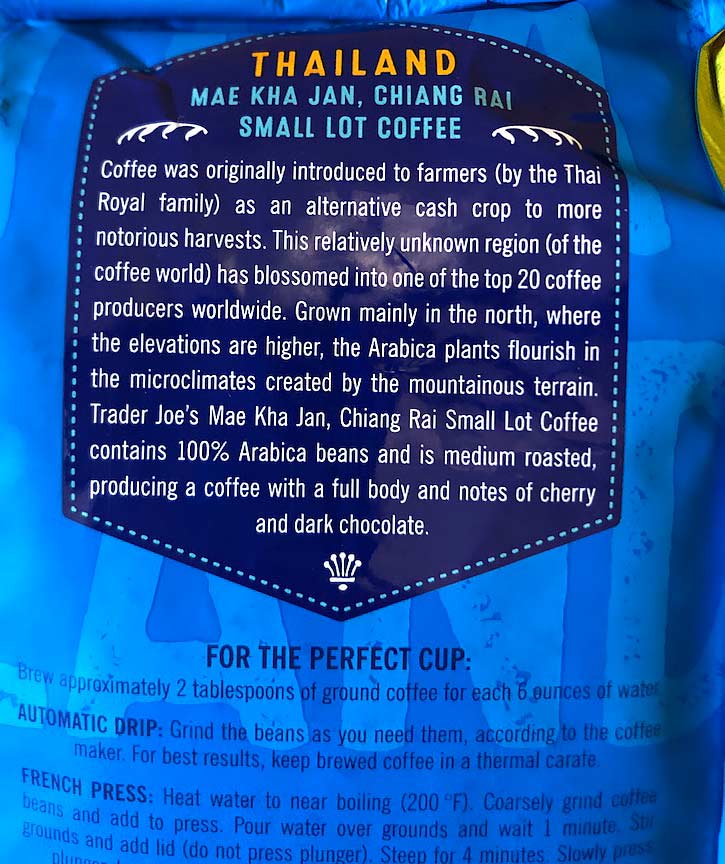 “Thailand has become a rising star in the coffee world over the past few decades. Much of this coffee production happens in the northern Thai border region, commonly called the Golden Triangle. It’s from this region that we get the small lot Trader Joe’s Thailand Mae Kha Jan Chiang Rai blend.