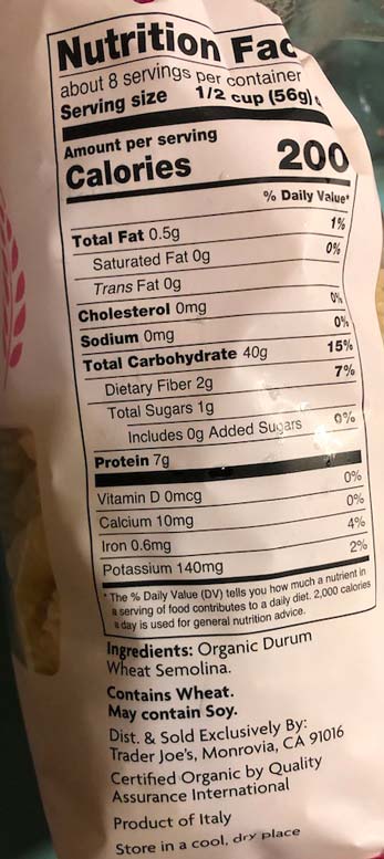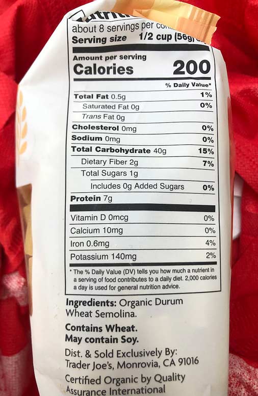 A 1 lb package goes for $1.99. It’s a high quality, bronze die cut pasta, imported from Italy and made from organic durum wheat semolina.