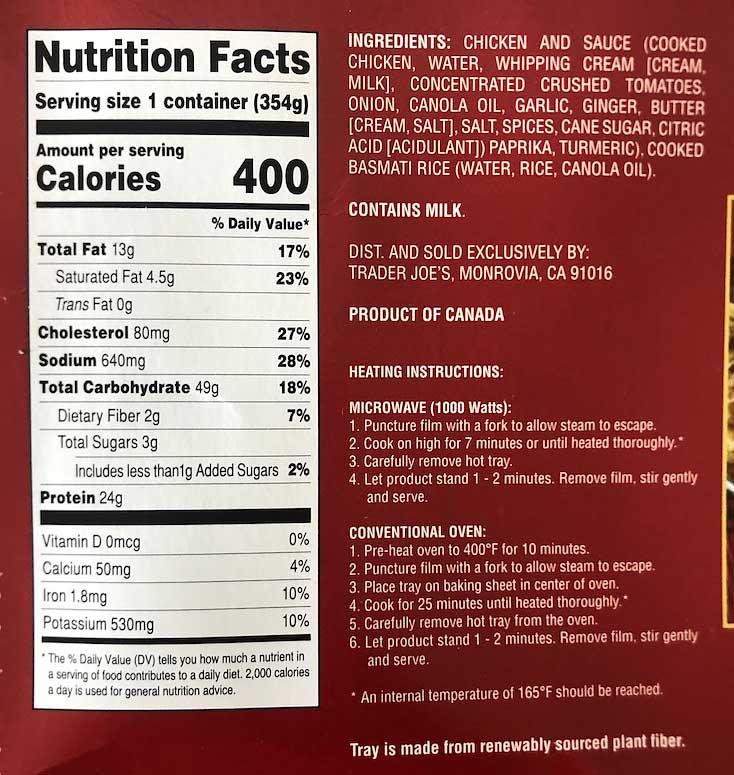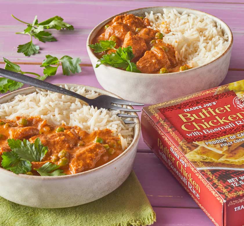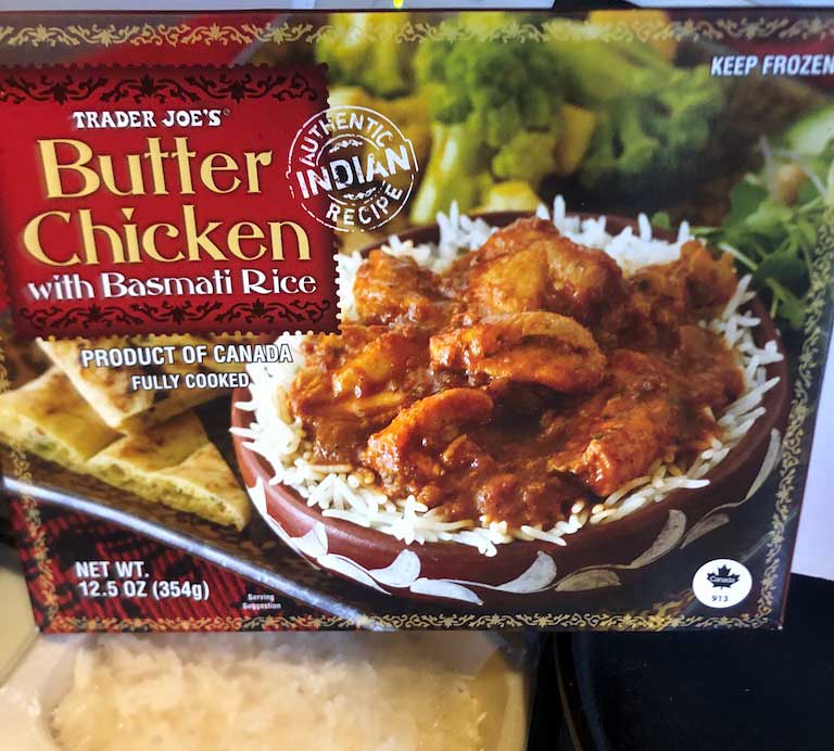 They say this: “Trader Joe’s Butter Chicken with Basmati Rice is the ultimate #Cookinghacks for this dish. Our Butter Chicken showcases chunks of chicken enrobed in a mild, mouth-watering curry crafted of crushed tomatoes, cream, onions, garlic, ginger, butter…Spiced just so, and partnered with delicate, fragrant grains of Basmati rice, it’s ready to heat and enjoy. Serve it with our other frozen Indian fare – TJ’s Palak Paneer, TJ’s Channa Masala, TJ’s Tandoori Naan – for a feast. Don’t forget the TJ’s Mango Ginger Chutney & sliced cucumbers!” https://www.traderjoes.com/home/products/pdp/butter-chicken-with-basmati-rice-099032