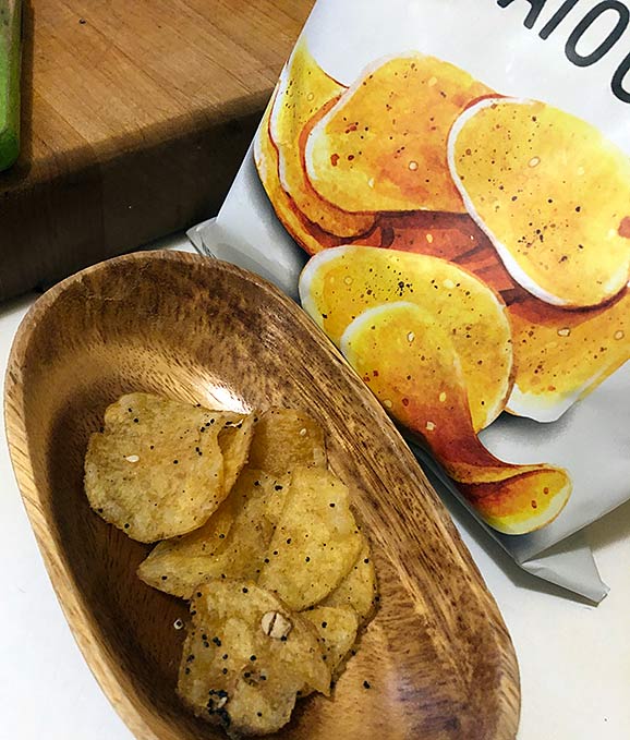 TJ’s says: “Made with Lady Clair and Dakota Pearl potatoes grown in western Canada, our supplier fries these Chips in small batches, then kettle-cooks them until they’re ready to be seasoned and cooled. This method, as opposed to the typical “continuous fry” method of chip-making, results in extra-flavorful chips with a harder, crunchier bite.”
