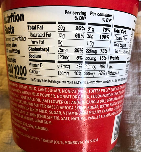 “When we set out to create this latest addition to our seasonal ice cream lineup, we could have very well started and ended by just adding bits of crunchy English toffee to something plain and simple, like chocolate or vanilla— English toffee is more than delicious enough to work on its own. But that’s not what we did. We decided, instead, to go the extra mile of adding bits of chocolatey-coated toffee and almonds to a rich, remarkably full-flavored base of brown butter ice cream. As a result, Trader Joe’s English Toffee Ice Cream is something even greater than a celebration of Toffee—it’s a symphony of sweet, buttery flavors, a revel of roasty, toasty, nuttiness, and a carnival of all things caramel-y in each and every spoonful.”