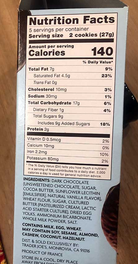 “These Cookies are, indeed, made for us in France. The usual cookie-dough suspects—flour, sugar, egg yolks, milk, leavening, and salt—are combined with cultured French butter (13% of the recipe) to create a dough that is shaped into thin rounds. The baked biscuits are coated in rich, Dark Chocolate (40% of the recipe), yielding an exquisite Cookie that is at the same time: smooth, crunchy, chocolate-y, and buttery!“