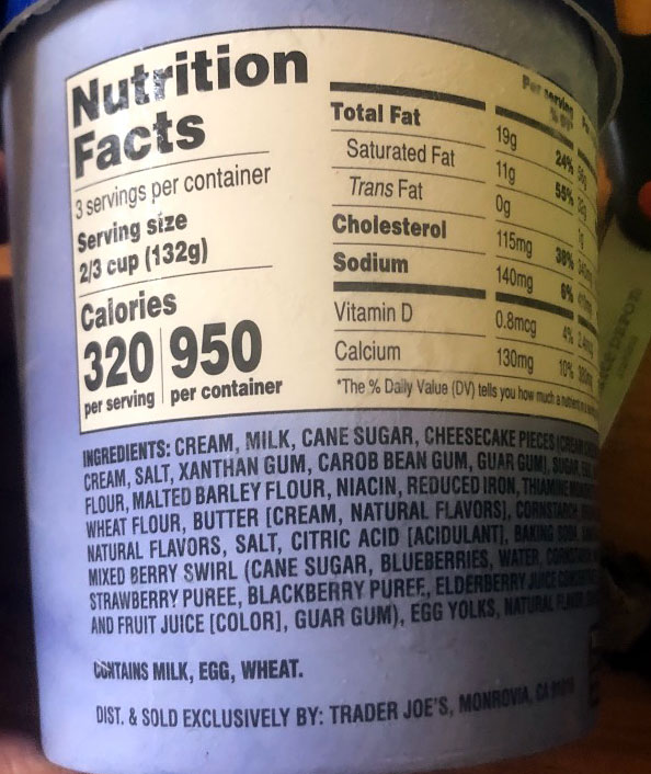 INGREDIENTS include : Cream, milk, cane sugar, cheesecake pieces…mixed berry swirl with blueberry, raspberry, blackberry, elderberry…