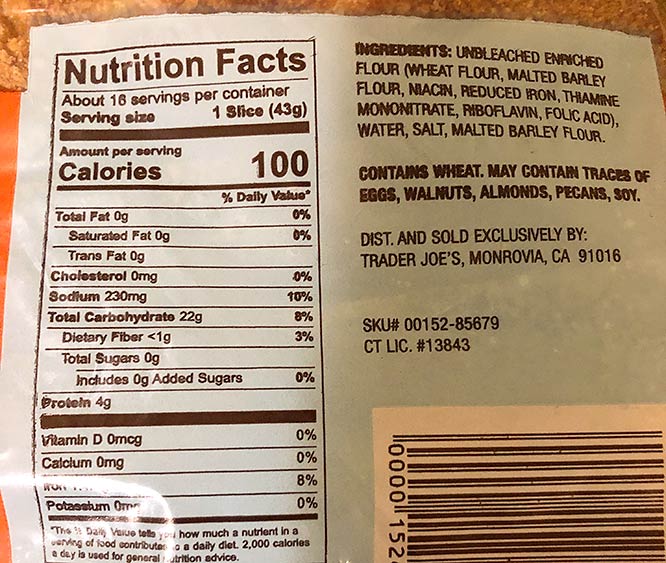 Its a round loaf, sliced up. The slices here are a bit thinner than another TJ sourdough, their CRACKED WHEAT SOURDOUGH which I also reviewed with a thumbs up. That bread is sliced thicker with about 13 slices to a loaf, while this one has about 16-17. One slice of this has about 100 calories.