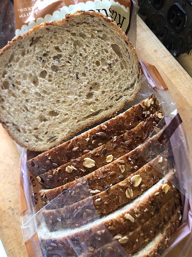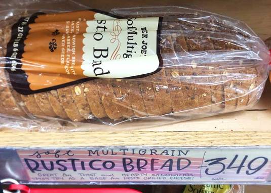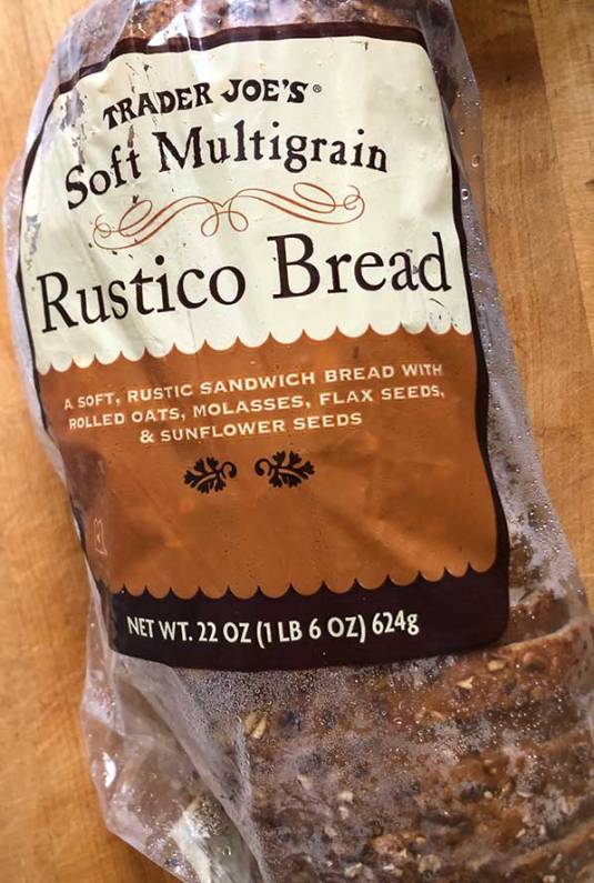 Trader Joe’s Multigrain RUSTICO BREAD – This is a very tasty bread you may have seen at Trader Joe’s at some point. Its a little soft with an oblong shape, kind of like a long skinny rye bread. The slices are roundish, again like a rye bread. The outside is coated with rolled oats and seeds.
