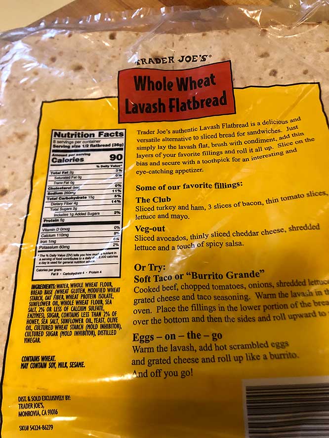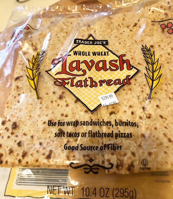 “Trader Joe’s authentic Lavash Flatbread is a delicious and versatile alternative to sliced bread for sandwiches. Use for wrap sandwiches, burritos, soft tacos or flatbread pizza”