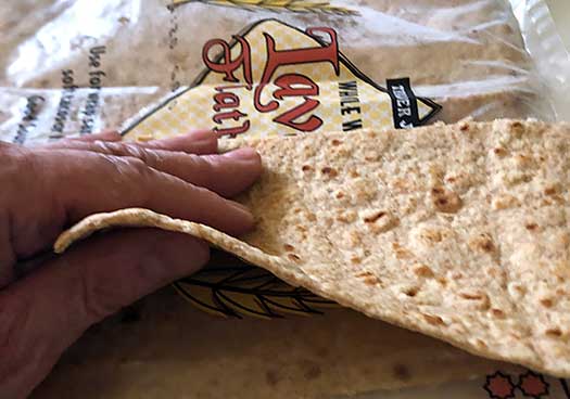 The sheets are large but are scored in the middle so they can be torn in half easily. To store it more than a day or two I keep the Lavash in the freezer, tightly sealed. It’s so thin it can defrost in just a few minutes and I am usually tossing it on a burner or into a pan to warm it.