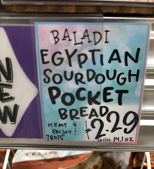 With the new Egyptian Baladi sourdough pocket bread Trader Joe’s finally has an excellentand authentic pita which is sturdy enough to split open and make a pocket that will hold ingredients, for say a falafal sandwich. And it’s Delicious. The BALADI SOURDOUGH POCKET BREADS are made by an Egyptian bakery for Trader Joe’s. So the real McCoy. These say “Product of Egypt”. Baked, then frozen, so as close to fresh as possible.