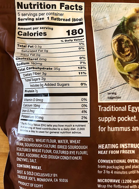 Trader Joe’s says: “We now offer Trader Joe’s Baladi Egyptian Sourdough Pocket Bread in our freezers. Made for us by a supplier in Egypt, these versatile (vegan) Baladi Pocket Breads take only a matter of minutes… to heat… before they’re puffed up, toasty, and ready to eat. Once heated, they have a tasty, slightly tangy Sourdough tinge to their flavor profile, and are ideal for stuffing with your favorite fillings. We’re partial to going with a classic combo of Falafel, chopped cucumbers, and our Garlic Spread-Dip, though they’re equally excellent when stuffed with our Gyros or Shawarma Chicken Thighs, too. And, of course, you can just serve them for dipping in hummus or tahini, as they do in Egypt.”