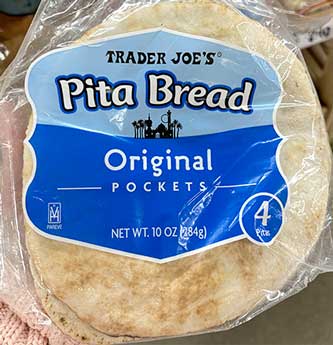 This “original pita bread” ($1.59) Trader Joe’s is fairly large, and on the thin side. I’ve always found these quite not sturdy enough to count on to make a pocket in, and hold the food. They kind of tend to fall apart when you fill them with ingredients as you are eating them.