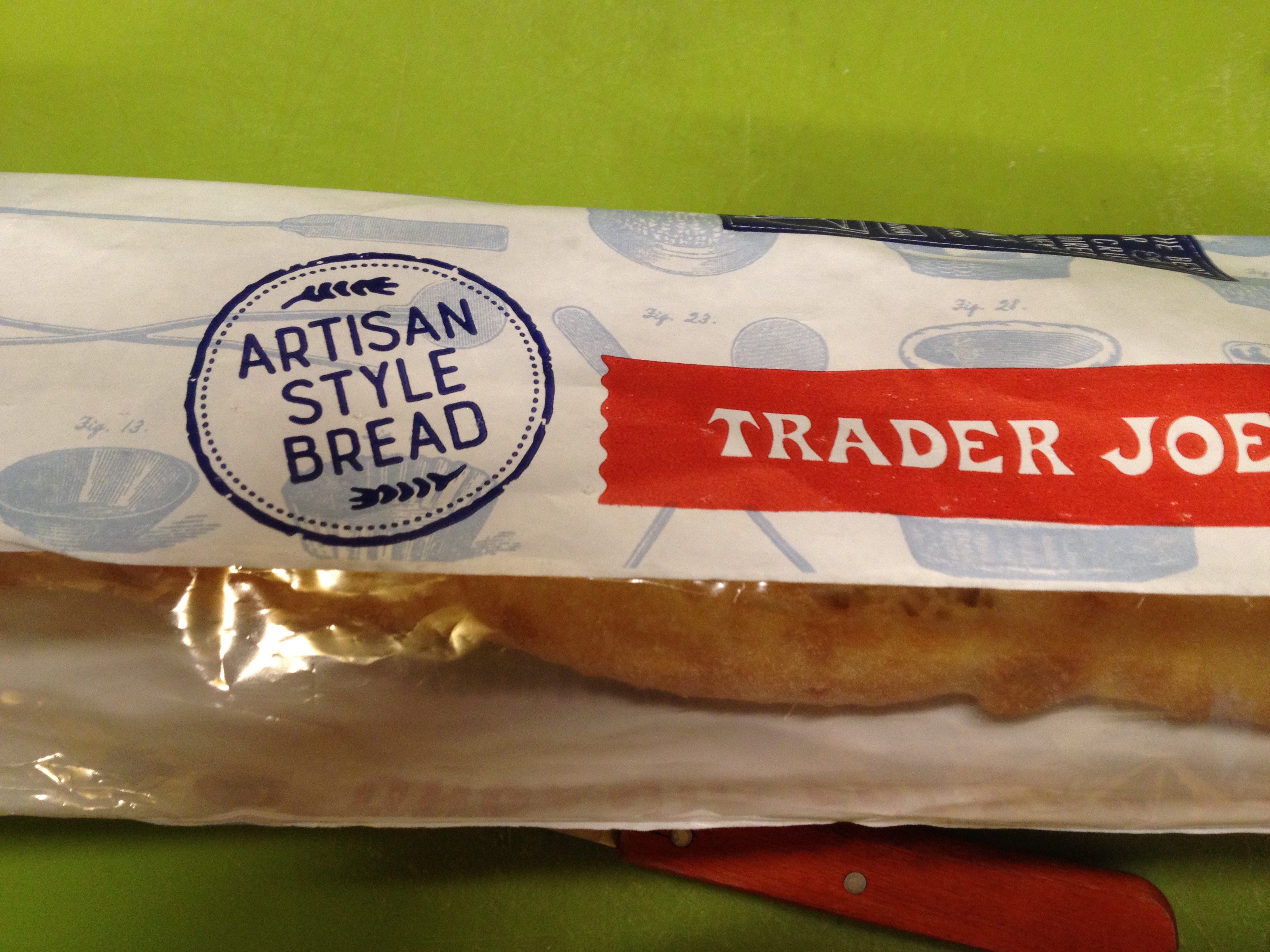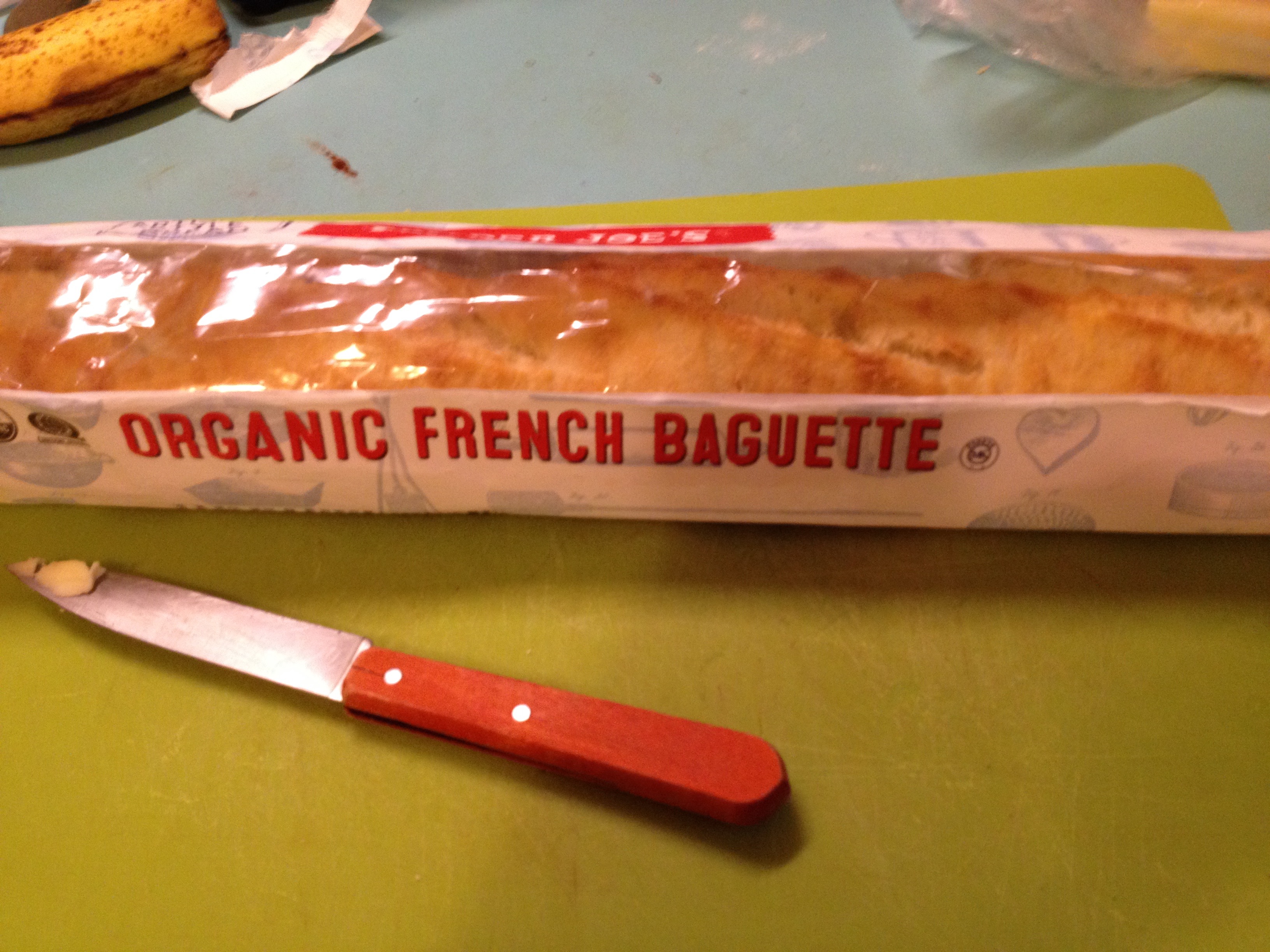 In a hurry? In an pinch, at least toast some slices up under the broiler (or in a toaster oven). I’ve even toasted it up on the stovetop in a black cast iron pan. Its worth the trouble. If you take the time to bake this you will get an excellent baguette! While I can’t say the TJ Organic French Baguette is exactly the equal to one from Maison Keyser, its not terribly far away either. Its one of the better commercial baguettes I’ve bought, period. This especially tastes great if you eat it with some really good butter like TJ’s “CULTURED FRENCH BUTTER” or Kerrygold Irish butter Good butter on this baguette still warm just out of the oven is amazing! Try it. Or do as TJ’s sample guy did and bake in some cheese. Ditto, amazing.