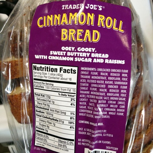 The name of the bread is a wee bit of Hyperbole if you expect this to ooze like a Cinnabun. However this is very, very good raisin bread with lots of cinnamon flavor. I love this Cinnamon Bread. It’s another of my “Must Have Always on hand” things from TJ’s (yes there are so many of those). The package says it’s “ooey, gooey…” well, its not really that ooey gooey it’s just a tiny bit gooey which is fine if you want to put this in your toaster…which you absolutely should! While it’s not bad as is untoasted, to get the full potential, do toast this bread up as by toasting it, the heat brings out the maximum cinnamon and raisin flavors. Don’t they sell Cinnabuns just out of the oven for this reason, so the smell wafts in the air? This bread toasts up to yummy perfection, however be careful and keep your eye on it and don’t let it burn or you’ll be sorry. Its a fine line from perfectly toasted, to burnt toast, i mean a few seconds.