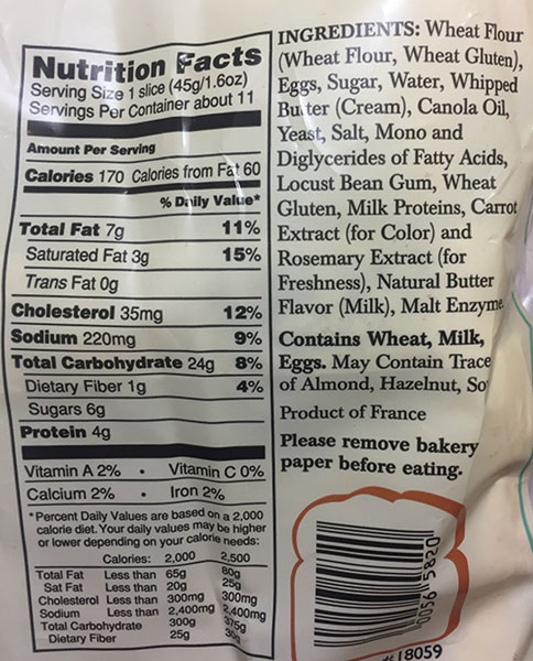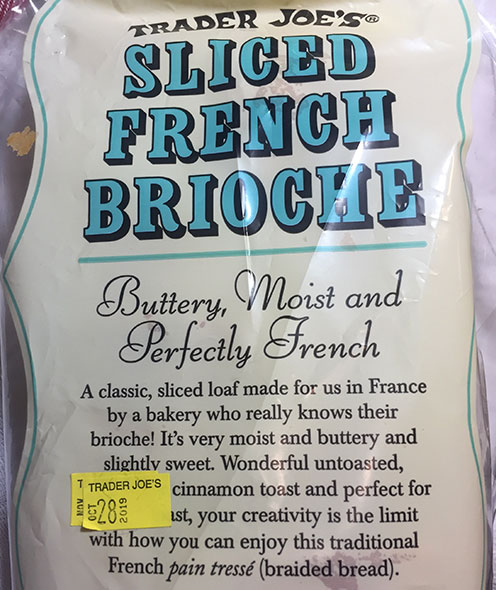 This is a “wow” TJ product, you know the so good, you can’t stop eating it kind. SLICEDFRENCH BRIOCHE bread is a best seller year round for Trader Joe’s and not for nothing. It’s terrifc. Almost anytime I go to TJ’s if I glance around the check- out line at customer’s carts, it’s almost a sure thing I will see a few in the carts. Sliced French Brioche is one of TJ’s most popular items. This is a soft, eggy, slightly sweet bread which comes in thick slices, about 1/2 inch thick. The bread is Made In France. So the Real McCoy.