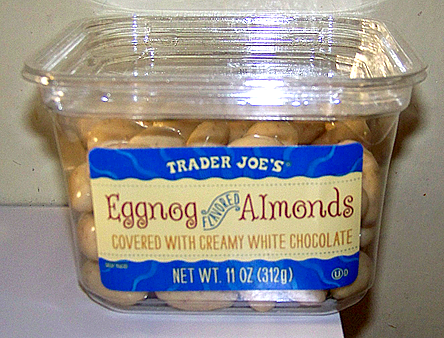 They are good-size almonds inside with a white chocolate outer coating, and they do taste like “Eggnog”. They have that flavor profile and spices. You can see flecks of nutmeg in the coating.