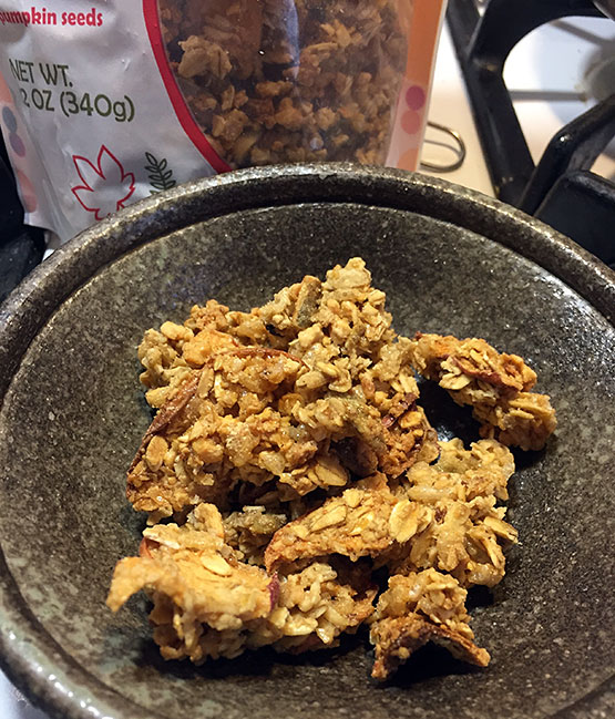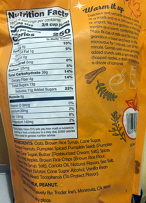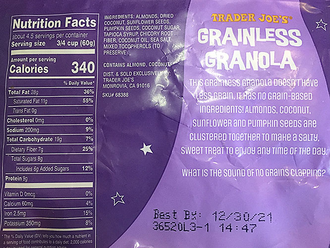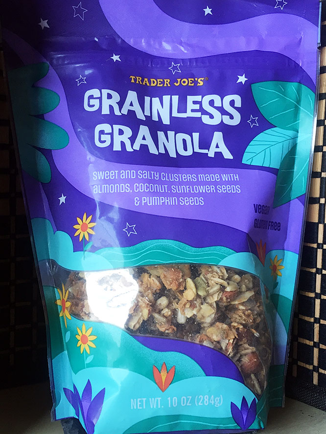 Also in the plus column is it’s low in calories, very low in fat, is low in sodium, has zero cholesterol, PLUS this cereal is low in Added Sugars, compared to almost any other cereal Trader Joe’s sells. So really compared to many others, this is a “healthy choice” in the Trader Joe’s cereal department. Maybe the healthiest cereal they sell?
