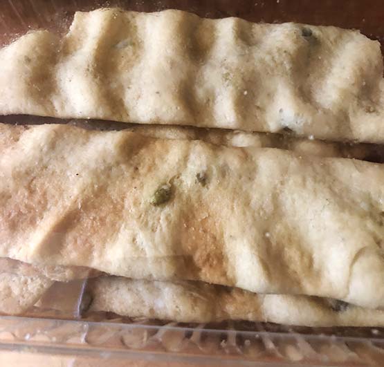 These are typical Italian style crackers, almost in the bread stick family. These ones however are flat and long, thin with a few bumps. They are very tasty. Light and crunchy, and one can definitely taste the flavor of green olives which you see a few bits and pieces of.