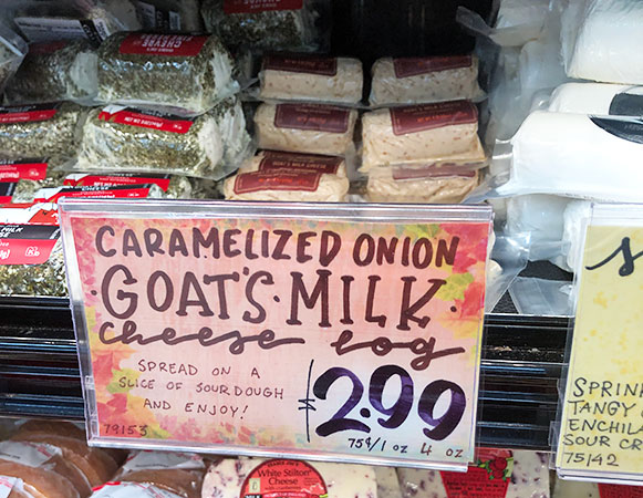 This cheese here (blue log of chevre) is a terrific goat cheese at a decent price. It’s TJ’s Number Two best selling cheese two years in a row and sells for three bucks! So if you want a soft not too sassy spreadable goat cheese I say buy that and make your own creamy goat with your preferred ratio of goat to cream cheese (1/2 of this for a milder cheese or the whole thing if you like a bit more tangy and goaty.