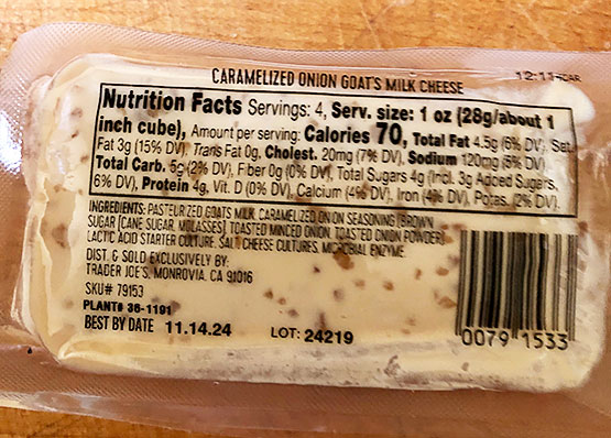 HOW TO MAKE CREAMY GOAT CHEESE for $5 bucks – Get a blue “Chevre” log and a package of cream Cheese. Wait an hour or two till they are soft. Mix cream cheese with whole (or half) the log of Trader Joe’s GOAT CHEESE (optionally you could add flavors, perhaps fresh herbs or black pepper. A few drops of lemon juice. You will get about 12 oz for a tiny bit more than this package (4.5 oz) costs, so cheaper in the long run too.