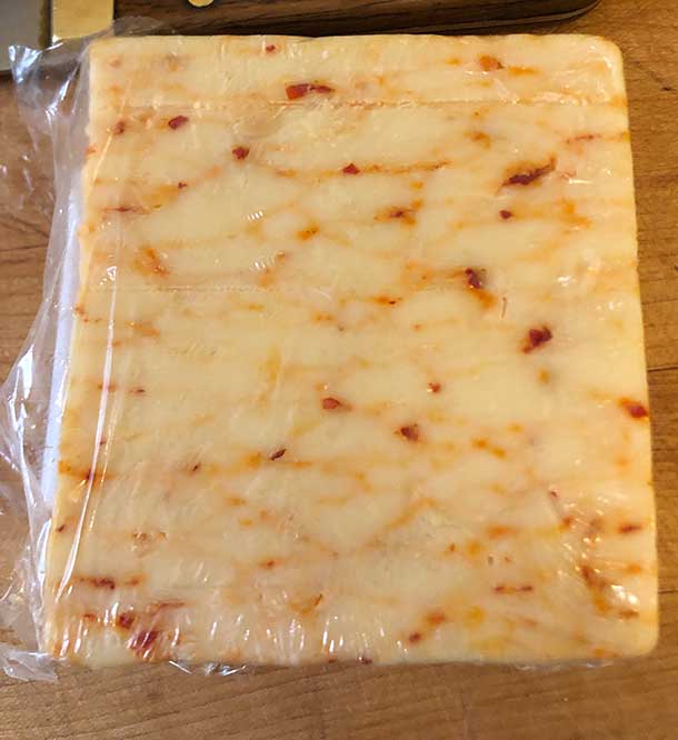 I really loved this cheese and apparently I’m not alone. I learned it can easily sell out fast at Trader Joe’s. If you look look at it you can see quite a bit of red in the cheddar, which is some red chilies. THey match well and make this cheese Spicy Delicious.