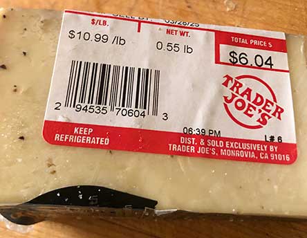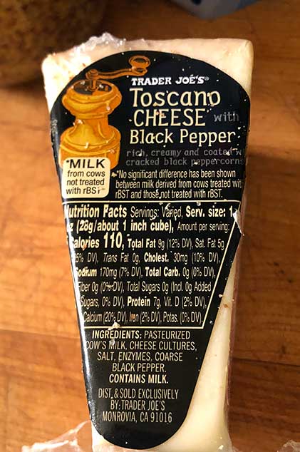TJ’s says: “One of our perennial favorite (cheeses) is Trader Joe’s Toscano Cheese with Black Pepper, an exceptional cheese that you don’t have to save for a special occasion. As it ages, each wheel of cheese is hand-rubbed with cracked black pepper, so every wedge features a burst of mildly spicy pepper flavor—the closer you get to the outside of the wheel, the more pronounced the flavor becomes, yet it’s never overpowering. Serve it on crackers, grated over pasta or shaved onto a freshly prepared steak.”