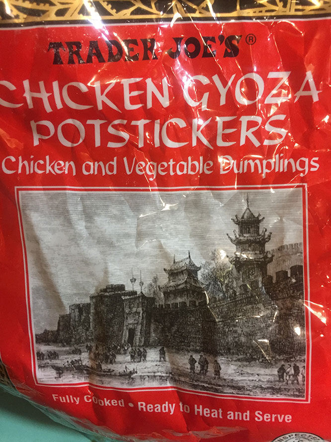 Chinese dumplings are one of my very favorite things to eat. Seriously. Over my lifetime I would not be surprised if I’ve eaten a thousand of them, in one small hole in the wall place or another, mostly in Manhattan’s Chinatown or Flushing’s. Flushing especially has become a destination for dumplings with terrific places that specialize in dumplings of all kinds. I’ve even learned how to make dumplings myself, from scratch, including at times even making the wrappers! (I usually buy them in an Asian market). However that’s too much for most people. Which is where these babies come in. When you just get a craving for Pot Stickers, you can buy these frozen Gyoza Pot Stickers that TJ carries in their frozen Asian section. They’re good! They’re cheap. $3 bucks a bag. Wow.