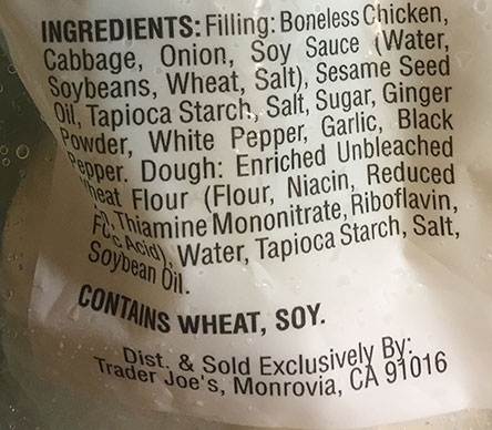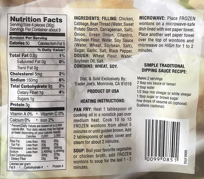 These are a tiny bit on the blandish side but a good dipping sauce can really make up for that with some nice Asian flavors in it. My first choice is to make these in a pan as Gyoza or Pot Stickers. Pot Stickers refers to first frying the bottoms, and then adding liquid to steam them, giving one the best of both worlds texture-wise in a single bite, with the wrapper both a bit crispy/chewy plus soft. The skins on these TJ dumplings are neither too thick nor too thin but acceptable in proportion to the filling. If I make them myself they would have thicker skins, be bigger and more packed with filling. But these do fine in a pinch. I have never tried cooking these in a microwave though the package states you can make them that way. Nor have I tried making boiled dumplings with these, as also suggested on the bag. If you did boil them in a strong flavorful chicken broth they might be very good that way, especially with some spinach, kale or other leafy vegetables, i.e., a “chicken soup with wontons and greens” type soup (hmm, i just gave myself an idea to try out!)