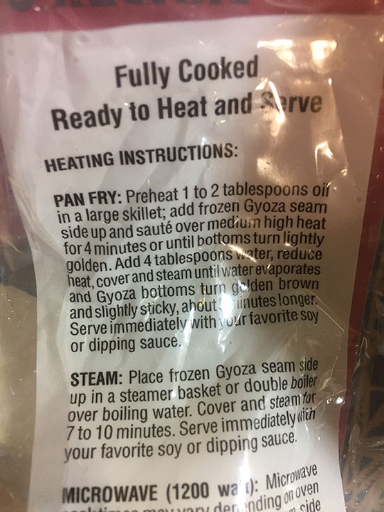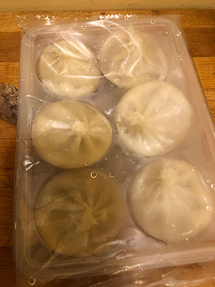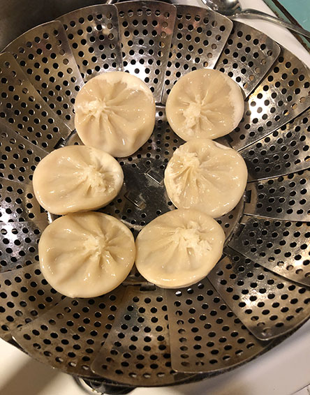 STOVE-TOP/STEAMED: “Fill a pot fitted with a steamer basket with water and bring to a boil. Place dumplings into steamer with space between them. Do not crowd. Cover with lid and steam for 8-10 minutes until fully heated. Remove carefully. Caution: these dumplings will be really really hot! Carefully pick up dumpling (chopsticks) and place on a spoon. Carefully bite dumpling to release the soup into the spoon. Slurp carefully. Eat dumpling”