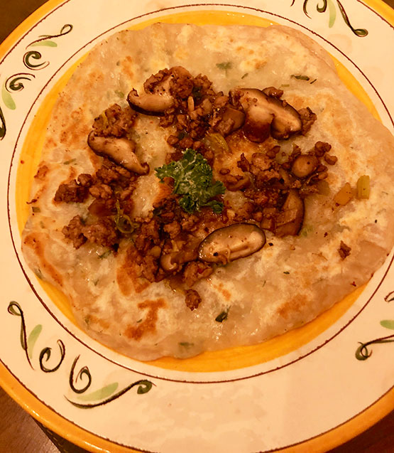 Pancakes topped with sautéed shitake mushrooms and seasoned ground pork