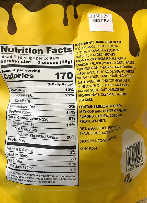 Trader Joe’s says this: “These Cookies are, indeed, made for us in France. The usual cookie-dough suspects—flour, sugar, egg yolks, milk, leavening, and salt—are combined with cultured French butter (13% of the recipe) to create a dough that is shaped into thin rounds. The baked biscuits are coated in rich, Dark Chocolate (40% of the recipe), yielding an exquisite Cookie that is at the same time: smooth, crunchy, chocolate-y, and buttery!”