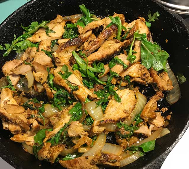 When the thighs are done on the second side, which may take about another 8 minutes, you can remove them to a cutting board or plate. Let the chicken rest a few minutes before slicing. Slice as thicky or thinly as you wish. Put the sliced chicken back into the warm pan (heat is off) scraping in any juices from your cutting board. If you made veggies, you can mix the chicken with them or keep them separated as you see fit. Below is chicken, onions, and some fresh arugula mixed into the warm chicken.