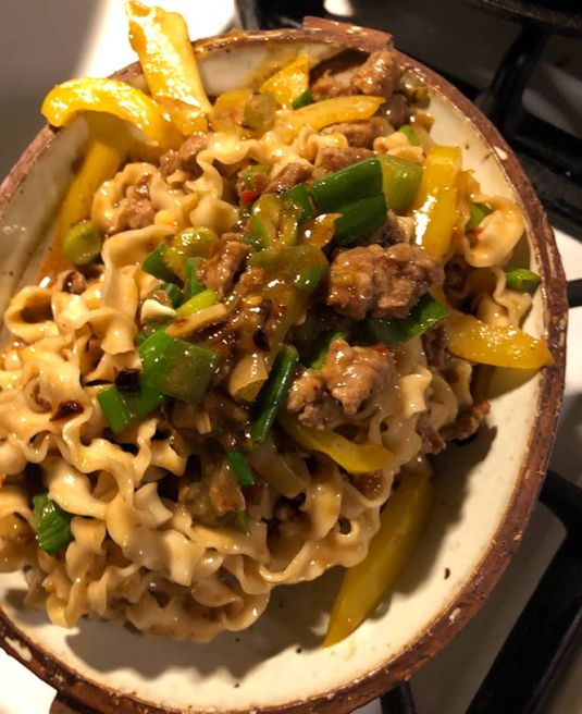 Like almost any Asian noodle, something as simple as throwing on chopped scallions, or cilantro will add a good deal of Asian flavors. Here I have added the TERIYAKI CHICKEN MEATBALLS plus yellow bell peppers in a stir fry with the noodles.