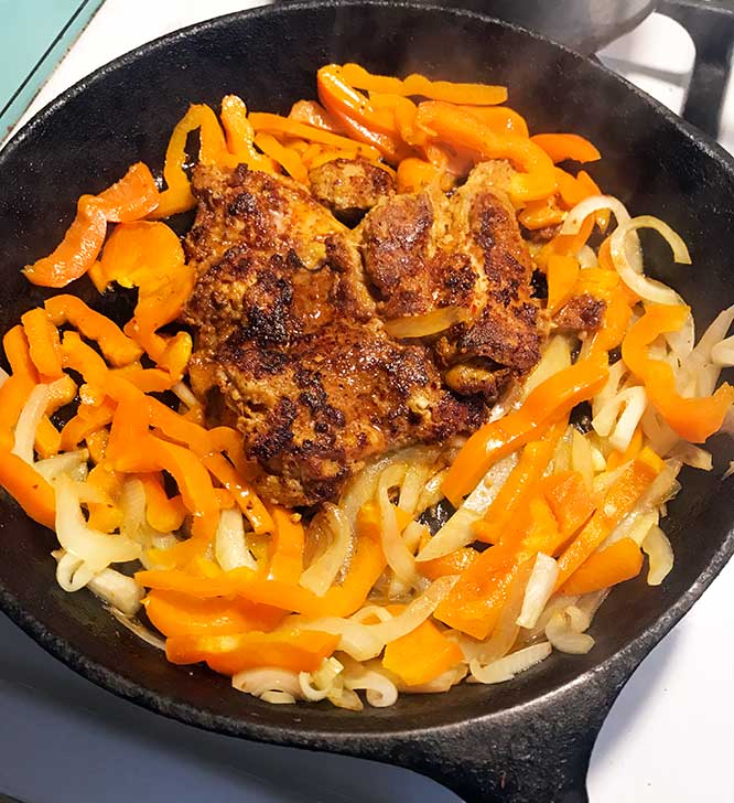 Now there are a number of ways you can cook the chicken. Grilled in a pan, baked in the oven and I’ve even read some people cook these in an Air Fryer. Please don’t even consider cooking this in a Microwave. The chicken needs to be browned to taste good). My simple preferred and I think easiest method is the first: grilling on the stove top. I like to use a cast iron pan but if you don’t have one of those babies any fairly heavy pan will do. Naturally cooking it on an outdoor grill would be great if you can do that. If you want to bake the thighs, you can put them on a sheet pan (use parchment or foil for easy cleanup) and bake them for about 20-25 minutes at 450.