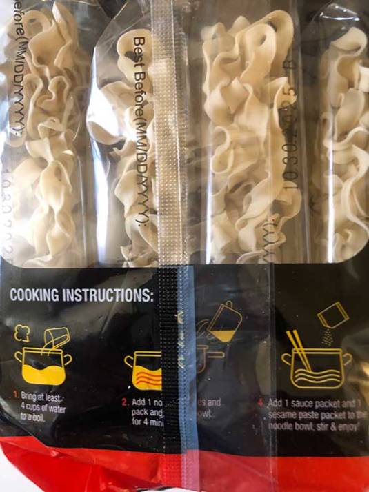 Each noodle pack here comes with two little sauce packets. One is labeled “Sesame Seed Paste“. The other, “Creamy Spicy Garlic Sauce“. You mix them together. The combined flavors make a decent sauce. Why are they separate? Because the sesame paste clumps. So much that I found it impossible to squeeze out the sesame paste. It’s so thick and clumpy. TIP: I cut the packet open with a pair of scissors. Then I had to use a small spoon to scrape out all the clumpy dark sesame paste plus it’s oil. A bit messy but worth the trouble as this dark (roasted?) Asian sesame paste does have a lot of flavor.