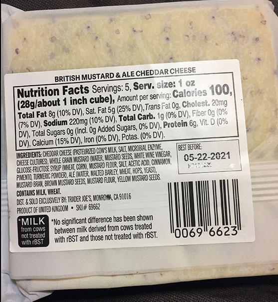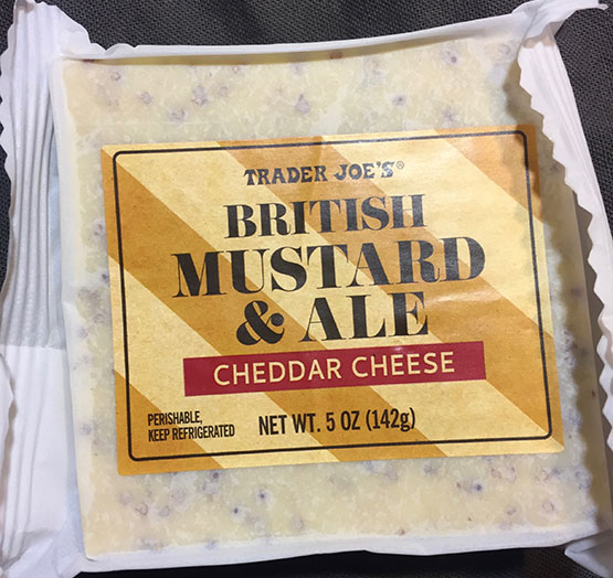 Trader Joe’s “British Mustard and Ale Cheddar”? Hmmm…Sounds a bit intriguing, no? Comes in a small package, only 5 ounces and kind of cheap, it was well under two bucks. Now I have to say I’m not usually one who is too into cheeses with added “flavors”. Still on rare occasion you do come across a quite decent cheese with something added to the cheese that works quite well. An example are some Dutch Gouda’s that have cumin or caraway seeds in them. I’ve tried some that are really delicious. I didn’t know what to expect from a Mustard and Ale Cheddar. I love mustard with cheese of course especially cheddar. So I got some of this mustard and ale cheese to taste, and frankly thought well it’s OK, its got a lot of whole mustard seeds in there which are a little strong, maybe over-shadowing the cheddar. I couldn’t put my finger on the “ale” part really. So I think, it’s OK but would I buy more, no, not really, I’d rather buy a jar of TJ’s excellent Whole Grain Dijon Mustard and some Cabot Extra Sharp Cheddar or New Zealand Extra Sharp Cheddar and use some mustard as I see fit. But here’s the funny part. During this evaluation, I tasted a piece, then tasted another. Just one more bite…. ok one more… and soon I realized during this tasting I had eaten about half the package. It was hard for me to stop tasting this cheese! Maybe I liked it more than I though? So if the combination sounds appealing to you, you may want to give this a try and see what you think.